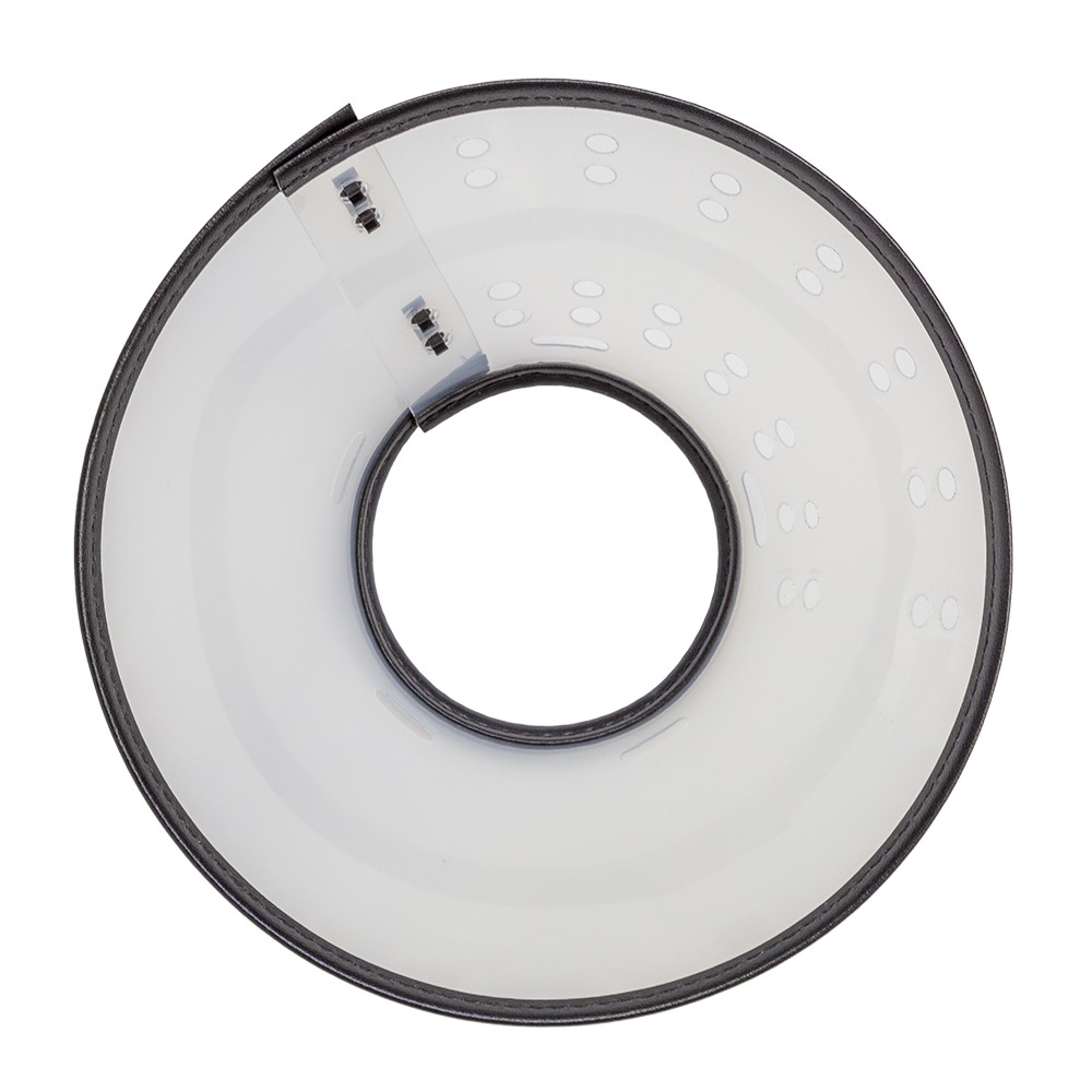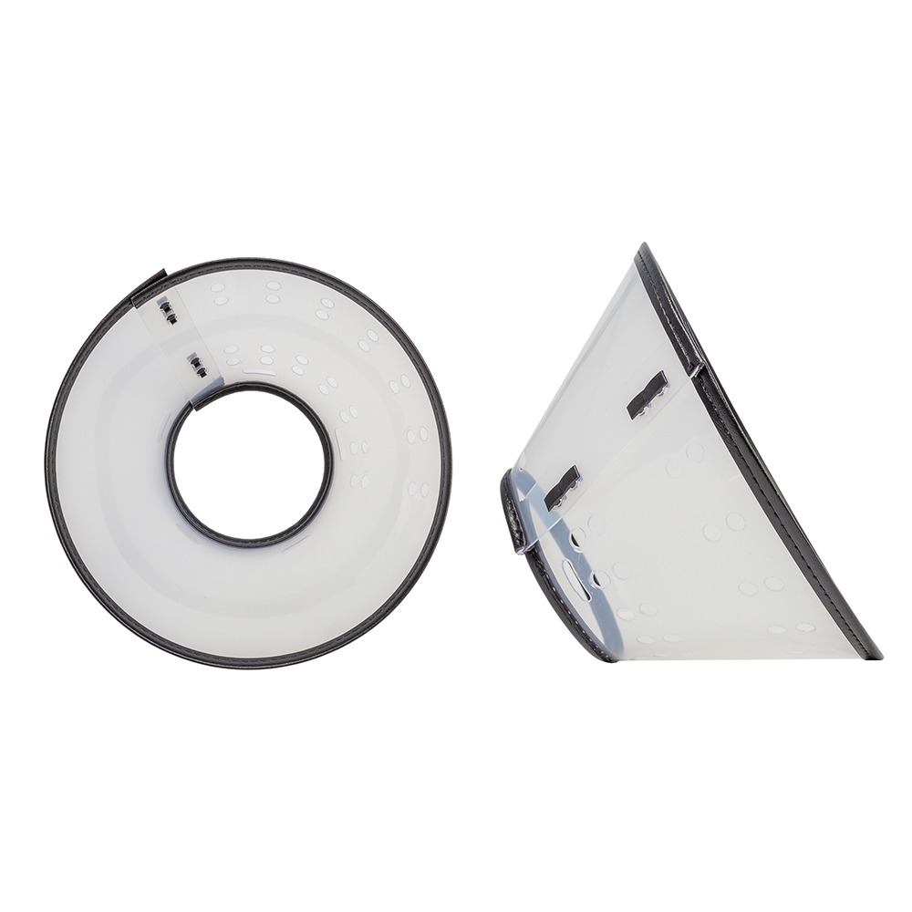 This translucent adjustable e-collar is lightweight with comfort soft edging and can be secured to your pet’s regular collar by threading ribbon or string through the oblong slots located around the inner ring of the collar.